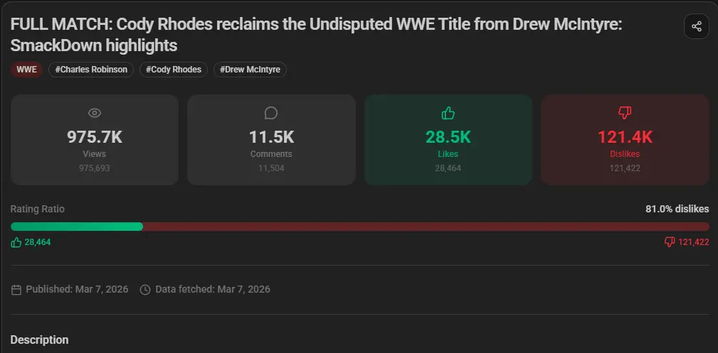 A vitória de Cody Rhodes sobre Drew McIntyre no SmackDown da noite passada, quando ele recuperou o Undisputed WWE Championship está dando o que falar. A grande maioria dos fãs não gostou do resultado do combate e está bombardeando a WWE no YouTube.