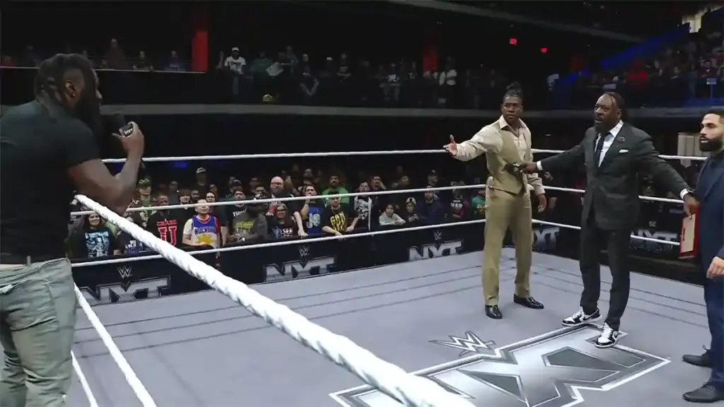 A celebração transcorria perfeitamente, incluindo um vídeo emocionante que apresentou a trajetória de Booker T no pro-wrestling, até que Keanu Carver, visivelmente irritado, surgiu para instaurar o caos.