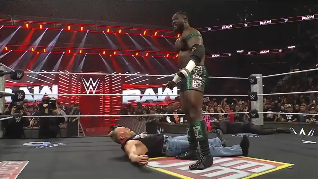 O nigeriano pisou sobre um Lesnar desacordado e apontou para o logo da WrestleMania 42, aceitando o desafio aberto.
